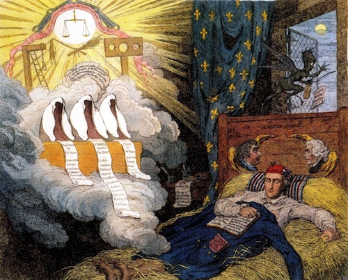The images are all of cartoons mocking Paine. From top down: George Cruikshank’s ‘The Age of Reason; or the World turned Topsyturvy exemplified in Tom Paine’s Works!!’, now in the British Museum; James Gillray’s engraving ‘Tom Paine’s Nightly Pest’; and Gillray’s ‘Thomas Paine’, now in the National Portrait Gallery in London.