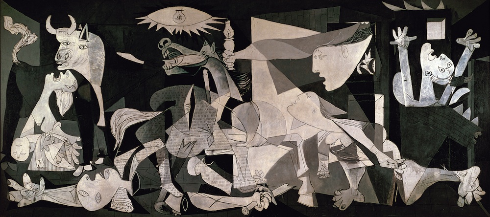 The paintings are all by Picasso: L’Etreinte (1901), Guernica (1937) and Pitcher with Apples (1919)