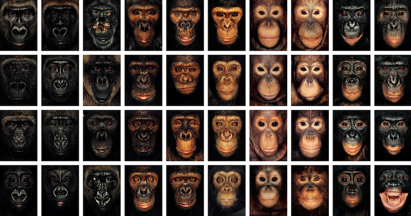 The two montages of Great Ape faces are by James Mollison and Ian Bickerstaff. The other images are stills and posters from the Planet of the Apes series