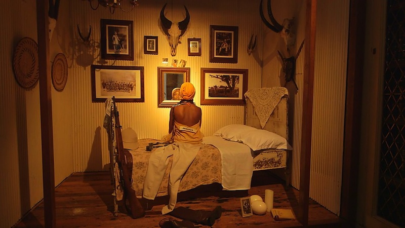 I saw Exhibit B at the Edinburgh International Festival, where the Playfair Library Hall, with its grand, white corniced ceilings and portraits of famous white men, provided the perfect stage. The first scene you encounter consists of a male and a topless female, exhibited as if they are artefacts – a shocking arrangement recreated from a natural-history museum exhibit from the twentieth century. Further along, a young woman sits before a mirror on an iron bed, chained by the neck, her bare back exposed to us. All of these scenes are accompanied by labels with statistics such as the age, height, sex and place of origin of the people. At the end of the hall are a group of disembodied heads – four performers from Namibia – singing the most beautiful songs. Indeed, with its careful attention to detail, the elaborate historical clothing and spot-lighting, and the actors, there is a great deal of beauty in Exhibit B – something which jars with the horror depicted.