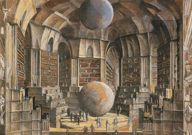 The images are Érik Desmazières‘ etchings for Jorge Luis Borges’ The Tower of Babel.
