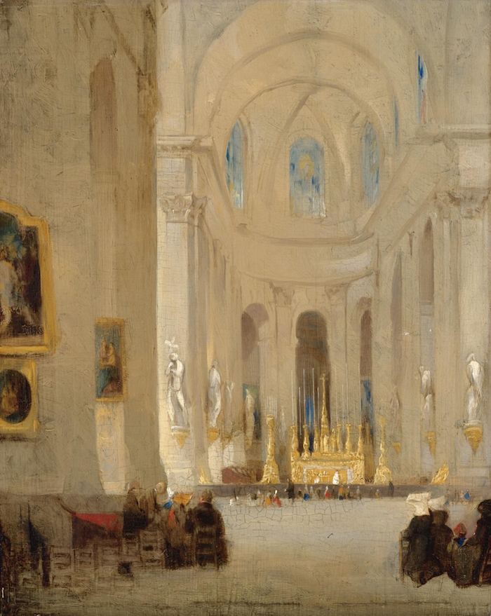 The paintings are of London by French artists and of Paris by British ones: The Houses of Parliament by Claude Monet, The Interior of St Sulpice by JS Davis, and the View of Pont Neuf by JMW Turner.