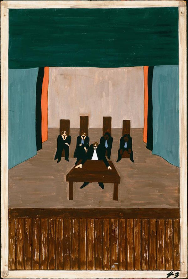 This year marks the centenary of the beginning of the Great Migration. To celebrate that anniversary The Museum of Modern Art in New York is organizing an exhibition bringing together all 60 panels of Lawrence’s work. (The panels have for the past 70 years been divided between MoMA and the Phillips Collection in Washington, with, bizarrely perhaps, MoMA holding the even-numbered paintings and Phillips the odd-numbered paintings ones.) I am publishing on Pandaemonium the complete set of panels from Lawrence’s series. In the first post, I wrote about the Great Migration and of Lawrence’s depiction of it, and published Panels 1-10. In later posts, I published panels 11-20, 21-30, and 31-40. Here are panels 41-50, together with Lawrence’s captions that are as simple and as bare as the paintings themselves, and an essential part of the work.