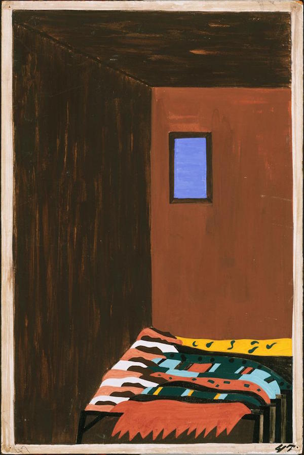 Born in 1917 in Atlantic City, New Jersey, Lawrence lived in Harlem from the age of 23, attended the Harlem Art Workshop, and was deeply shaped by these changes. Lawrence’s significance was in taking the forms of European modernism – he called his style ‘dynamic cubism’ – and reshaping them to speak to the experiences both of America as a nation and of African Americans specifically. In so doing he turned the Great Migration into a means of exploring a more universal tale, portraying not only a physical journey, but a spiritual one, too, capturing the sense of the fear, anger, despair and hope that travel with all migrants.