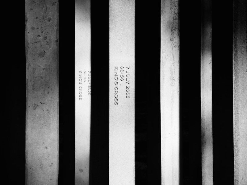 The photos are of the 7/7 memorial in London’s Hyde Park. The cover image is from Rachel Gunn’s ‘Divided Ground’.