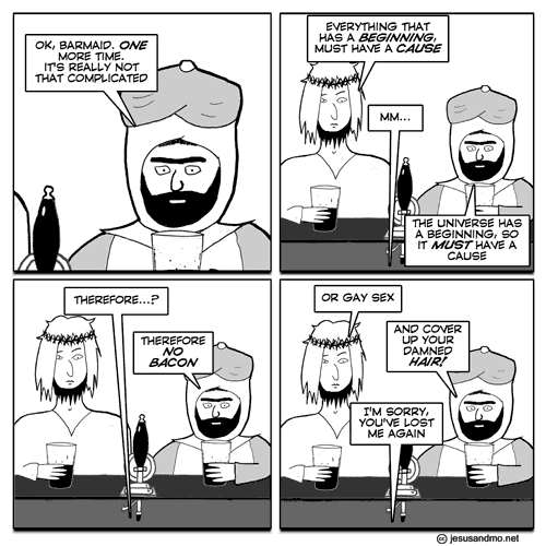 One of my favourite cartoons shows Jesus and Mo explaining to the barmaid the Aristotelian idea, later picked up by both Islamic and Christian theologians, that ‘Everything that has a beginning must have a cause’ and ‘the universe has a beginning, therefore it must have a cause’. ‘Therefore?’, asks the barmaid. ‘Therefore no bacon’, replies Mo. ‘Or gay sex’, chips in Jesus. It is a typical dig at the illogicalities of religious faith. It also, in Jesus and Mo’s inimitable way, taps into one of the most difficult theological conundrums for believers, the tension between the idea of God as ‘first cause’, or as a ‘condition of being’, and the God of scriptures that does all the other things that religion requires of Him: perform miracles, answer our prayers, wrestle with the devil, set down moral law, punish sinners. And tell us to keep off the bacon sarnies and gay sex. I give an hour-long lecture on this topic. Jesus and Mo get to the heart of the matter in four frames.